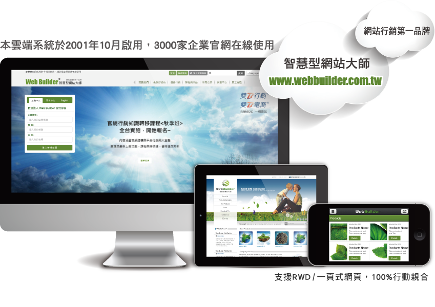 Web Builder 智慧型網站大師,功能強大又容易上手,即使您是初學者也能自行建立並管理官網,不必依賴他人。這套系統匯集了上千家企業的需求、經驗和美學設計,無論現在還是未來,都能滿足您的需求,讓您的使用體驗更為卓越。二十年來,透過數千家企業的使用,這個系統已被證實具有優異的表現。現在就體驗 Web Builder,讓官網成為您展現品牌、擴大行銷的關鍵利器。